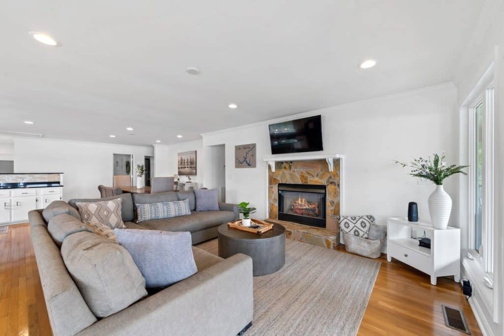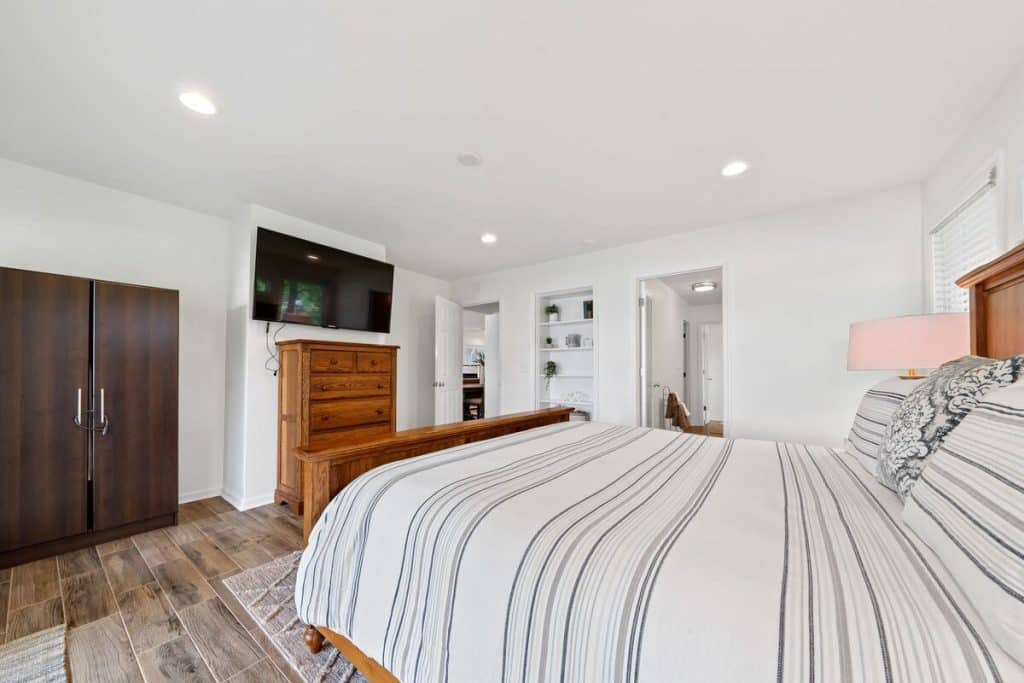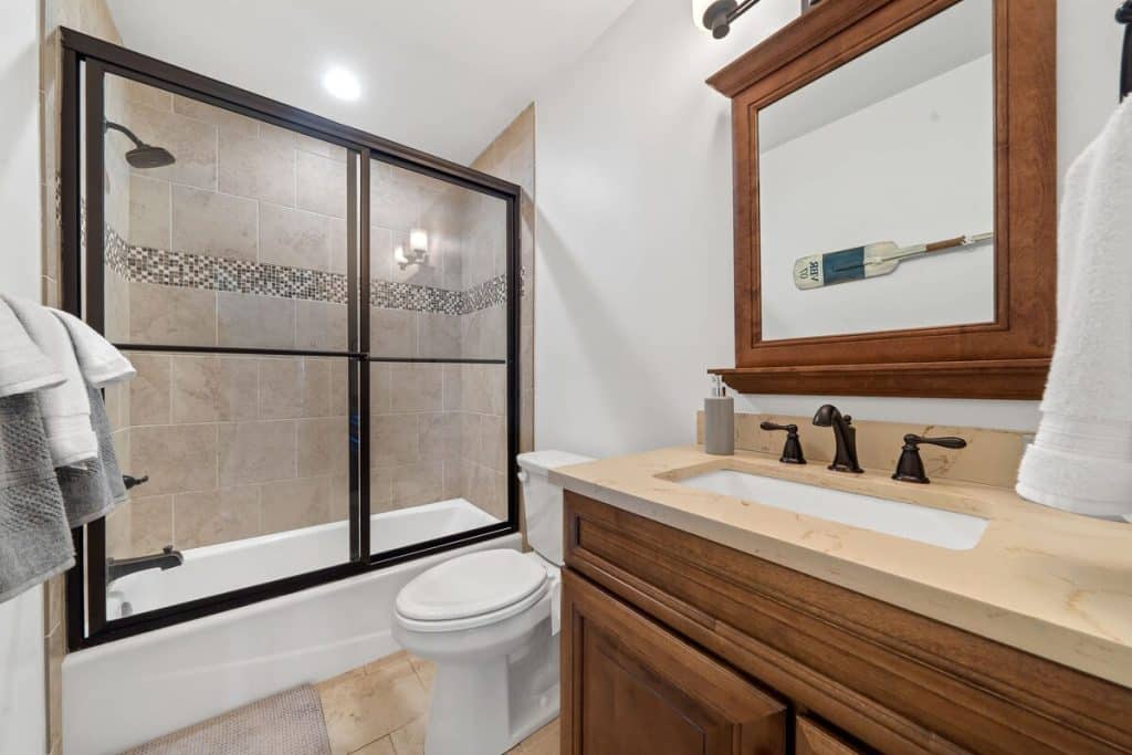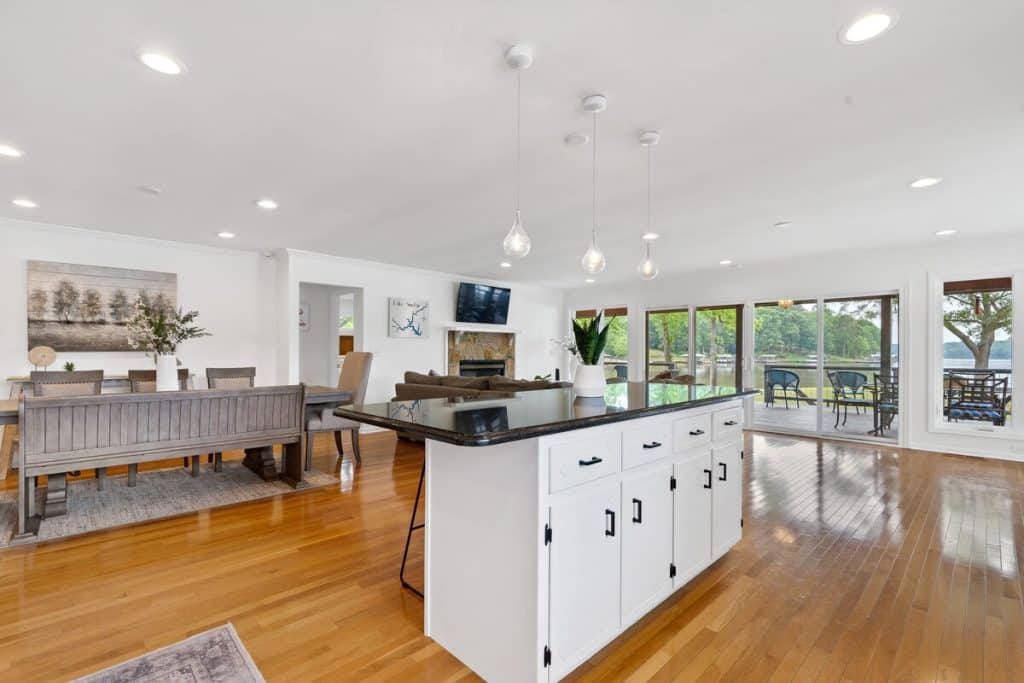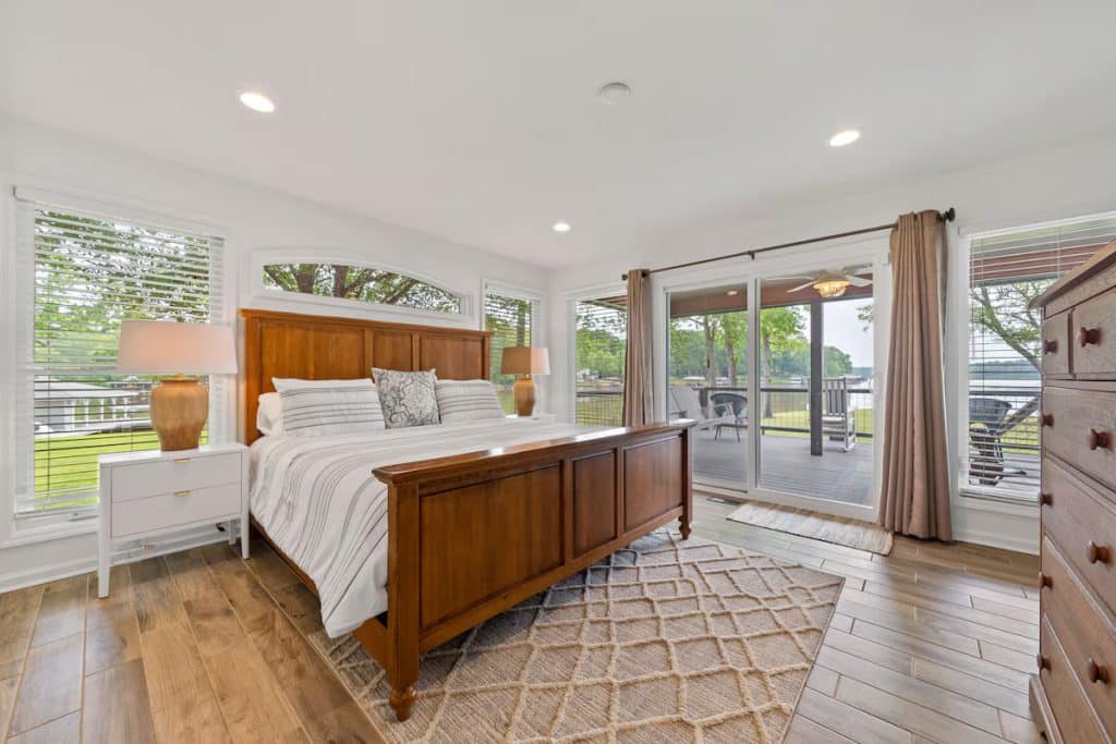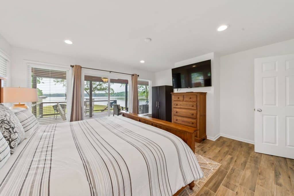 Inside, you’ll discover newly tiled showers and vanities in the bathrooms, providing a touch of modern elegance. The layout features a master bedroom with a king-sized bed and stunning lake views, and 4 queen bedrooms.